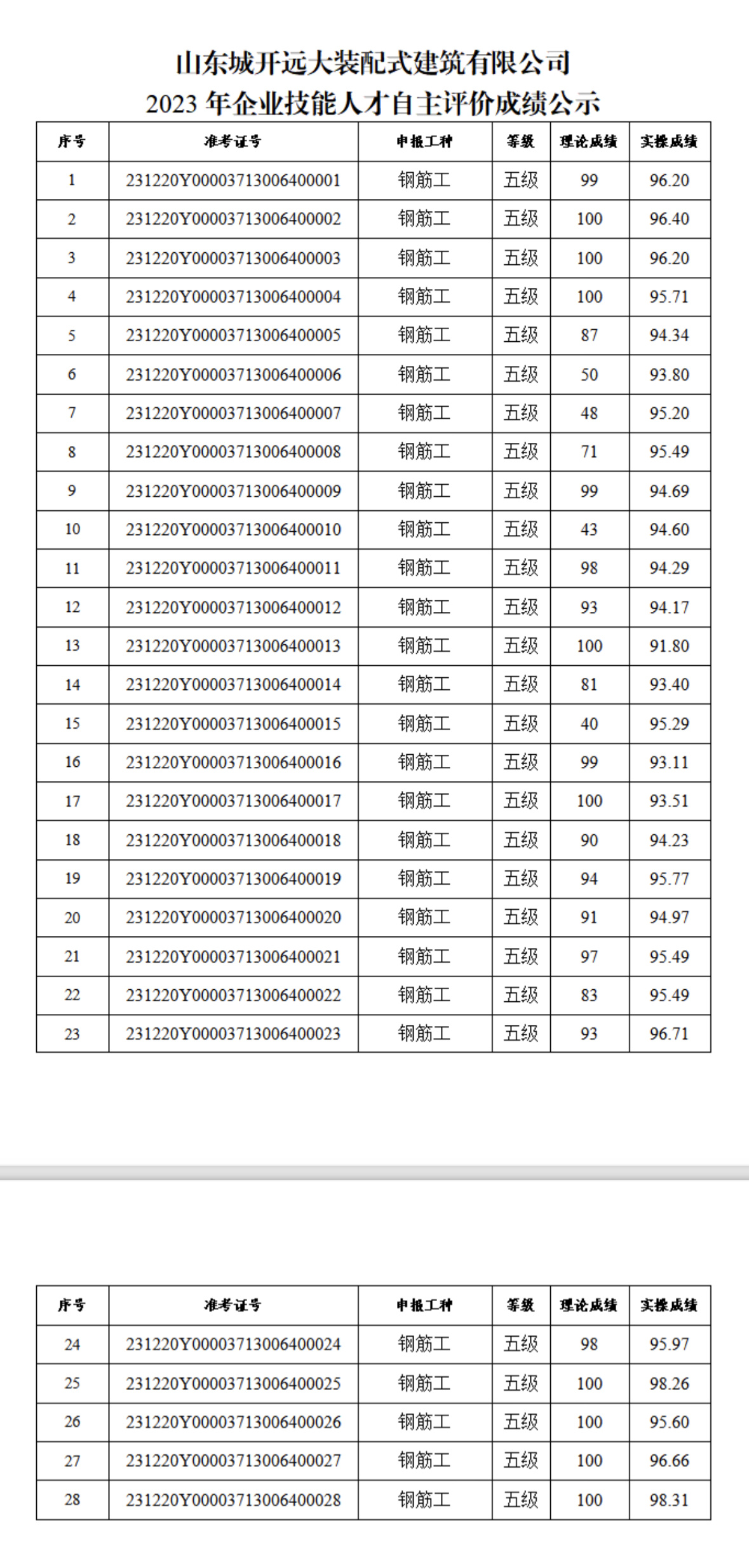 附件:山東城開遠大裝配式建筑有限公司2023年企業(yè)技能人才自主評價成績公示